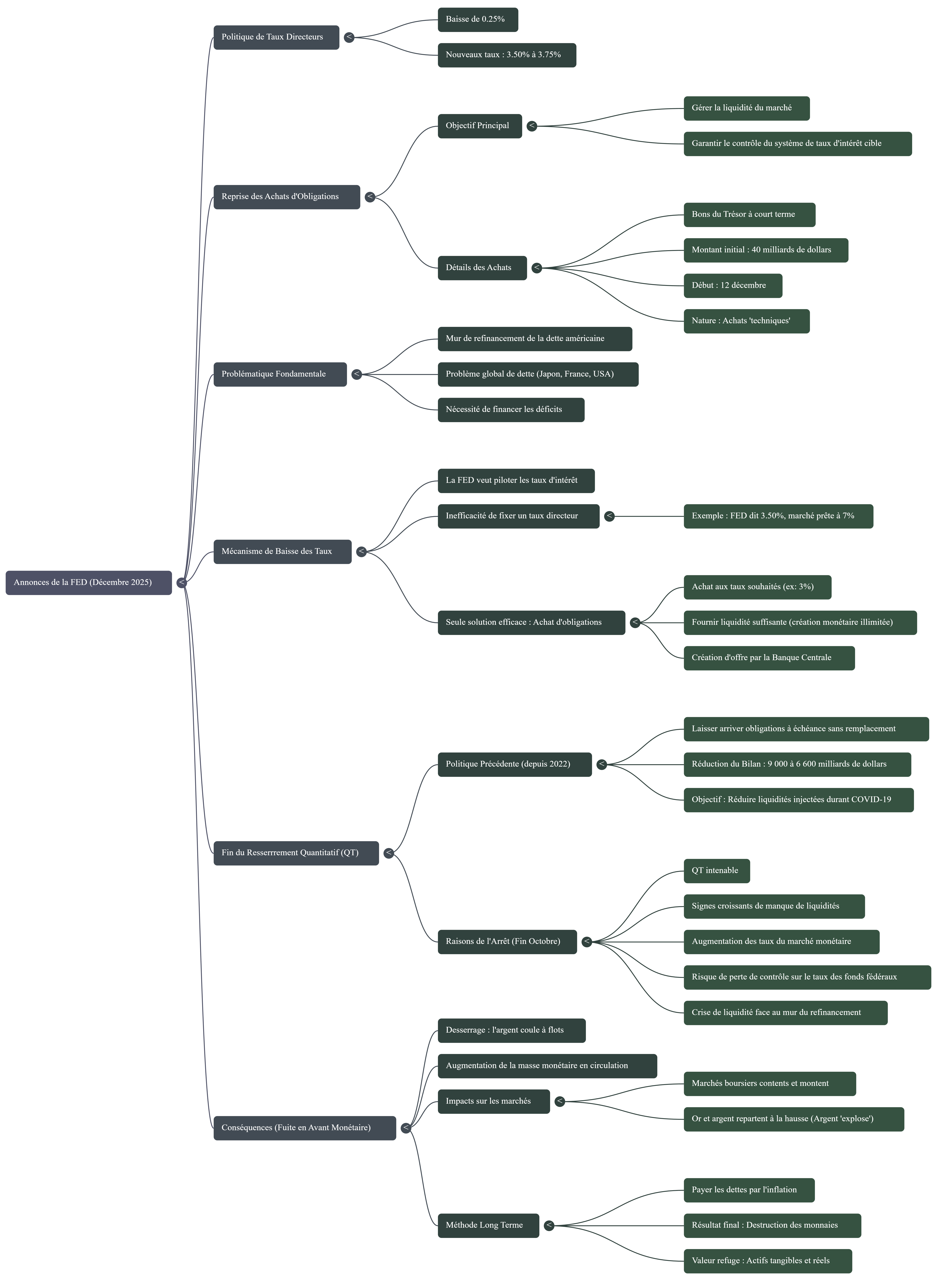 Lors de sa réunion du 10 décembre 2025, la Réserve fédérale américaine (FED) a présenté une feuille de route articulée autour de deux orientations majeures : un assouplissement prudent de sa politique de taux et une intervention technique ciblée sur le marché obligataire afin de stabiliser la liquidité. Les déclarations de Jerome Powell permettent d’en préciser les objectifs et la portée.