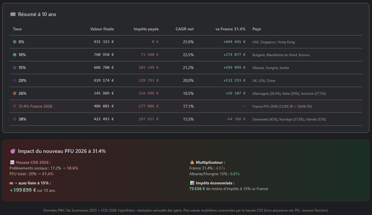 En partant sur une hypothese de fonds US agressif, période après Covid on a un chiffre impressionant – pour un francais – de 25%. Projections sur 10 ans / différentes fiscalités selon pays.