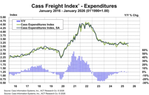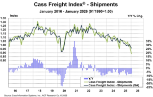 Le Cass Freight Index est l’un des indicateurs les plus fiables de l’activité économique réelle aux États-Unis. Publié mensuellement par Cass Information Systems, il mesure les volumes d’expédition et les dépenses de transport des grandes entreprises nord-américaines. Contrairement aux enquêtes de sentiment ou aux données financières, il reflète ce qui circule physiquement dans l’économie. Les données de janvier 2026 racontent une histoire que le marché semble vouloir ignorer.