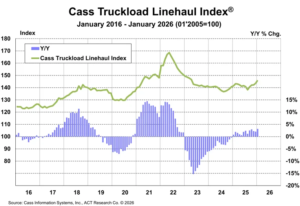 Le Cass Truckload Linehaul Index est peut-être le graphique le plus intéressant des trois. Après deux ans de compression (~2022-2024), l’indice remonte vers ~145 début 2026, et le taux de variation annuel repasse en territoire positif.