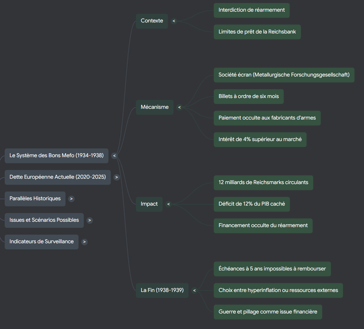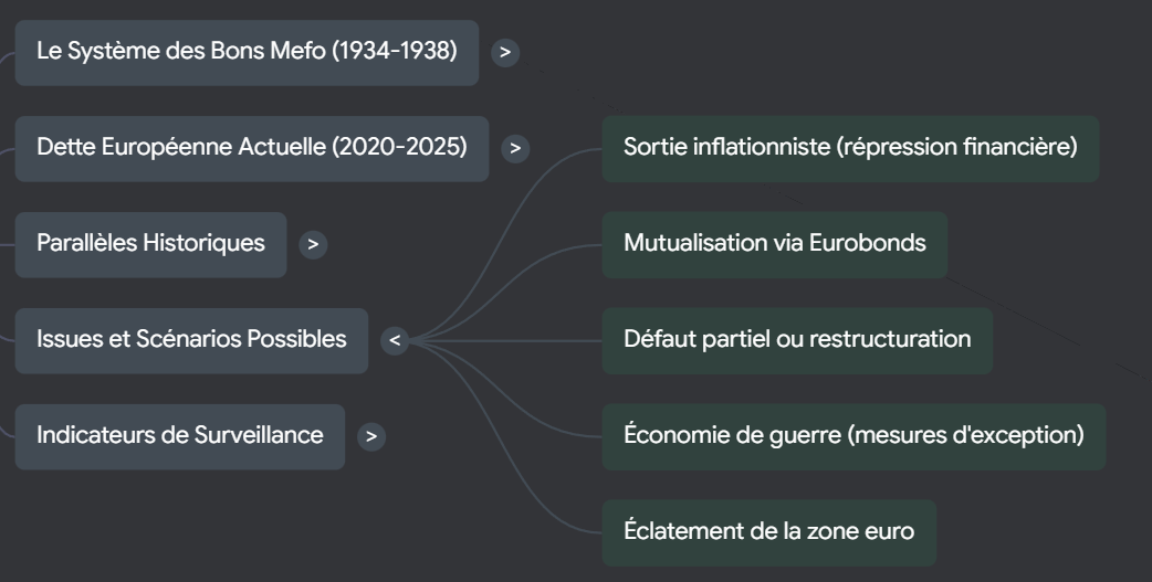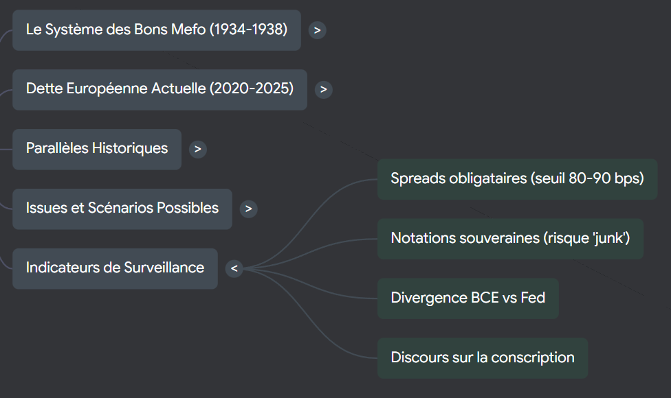 Entre 1934 et 1938, l’Allemagne nazie a financé son réarmement massif par un mécanisme financier ingénieux et opaque : les bons Mefo. Quatre-vingt-dix ans plus tard, l’Europe fait face à une accumulation de dettes souveraines combinée à une rhétorique de réarmement de plus en plus agressive. Ce rapprochement historique mérite une analyse détaillée.