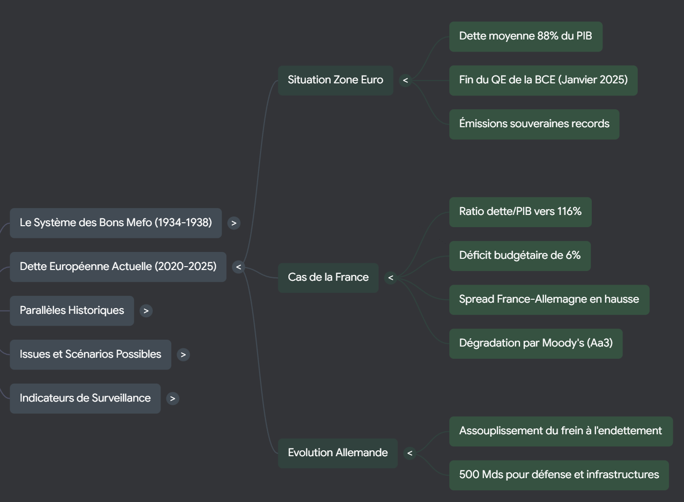 L’arrêt des rachats de dette souveraine par la BCE en janvier 2025 a mis fin à une période où les vrais coûts de financement des États étaient masqués par l’intervention de la banque centrale. Cette situation rappelle le rôle de la Reichsbank dans le système Mefo : une institution monétaire absorbant des créances douteuses pour maintenir l’illusion de solvabilité.