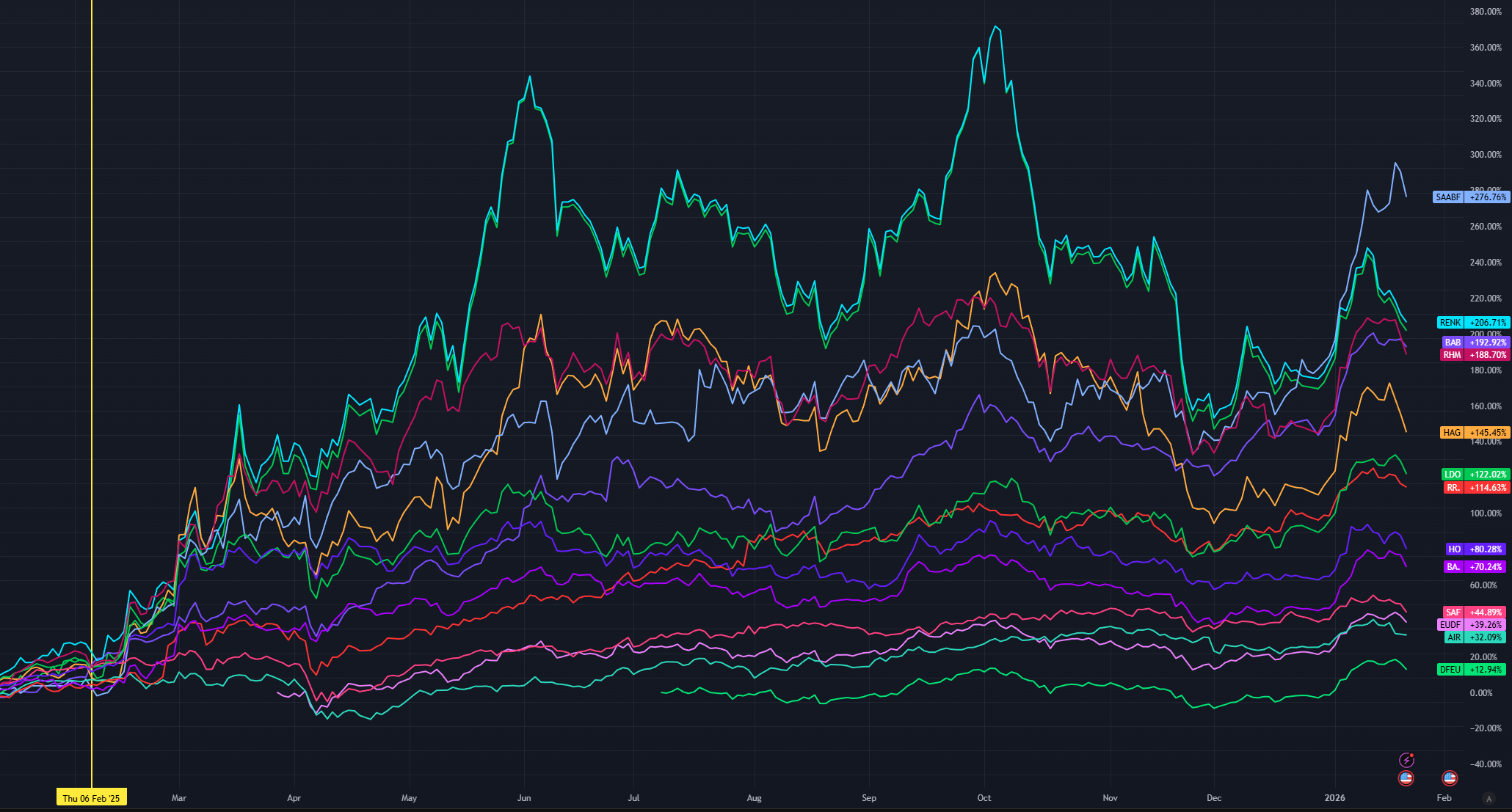 Illustration : les sociétés bénéficiaires du pacte de réarmement après l’allocution de VDL matérialisée par la ligne verticale jaune.