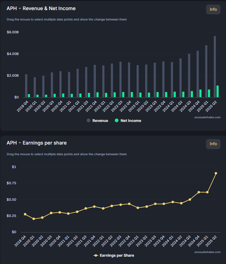 In Q2 2025, Amphenol posted revenue of about US$5.65 billion, beating a consensus of about US$5.01 billion. MarketBeat+1
